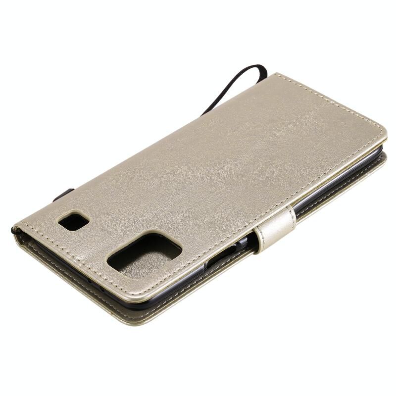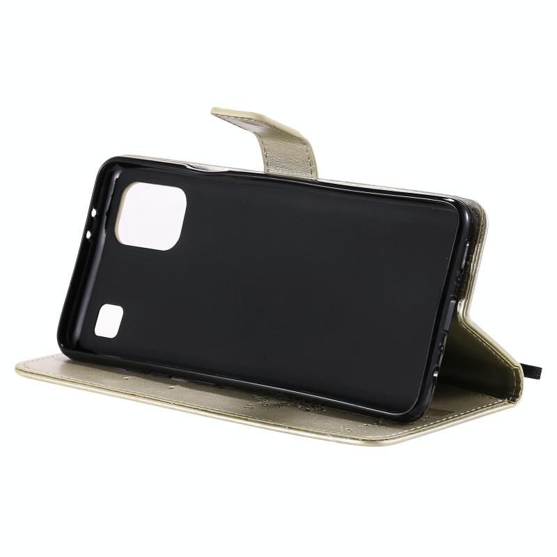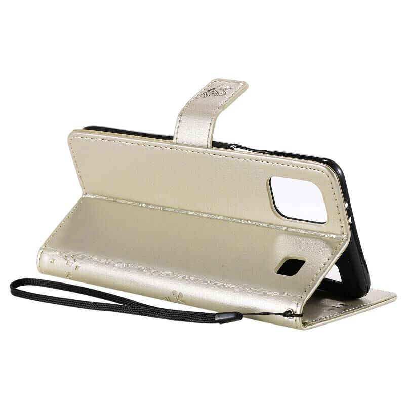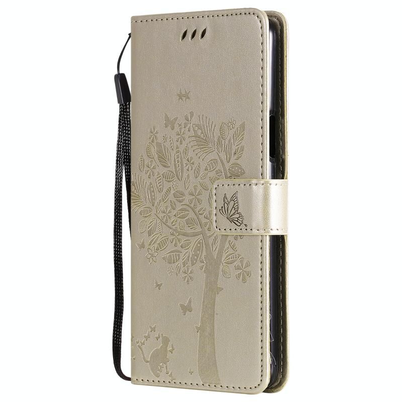 For LG K92 5G Tree & Cat Pattern Pressed Printing Horizontal Flip PU Leather Case with Holder & Card Slots & Wallet & Lanyard(Gold)