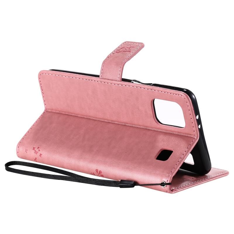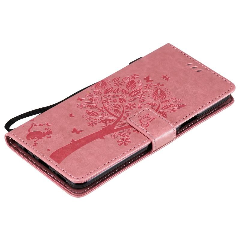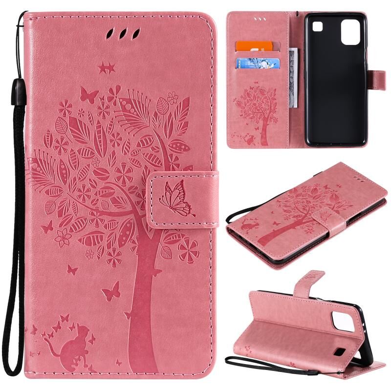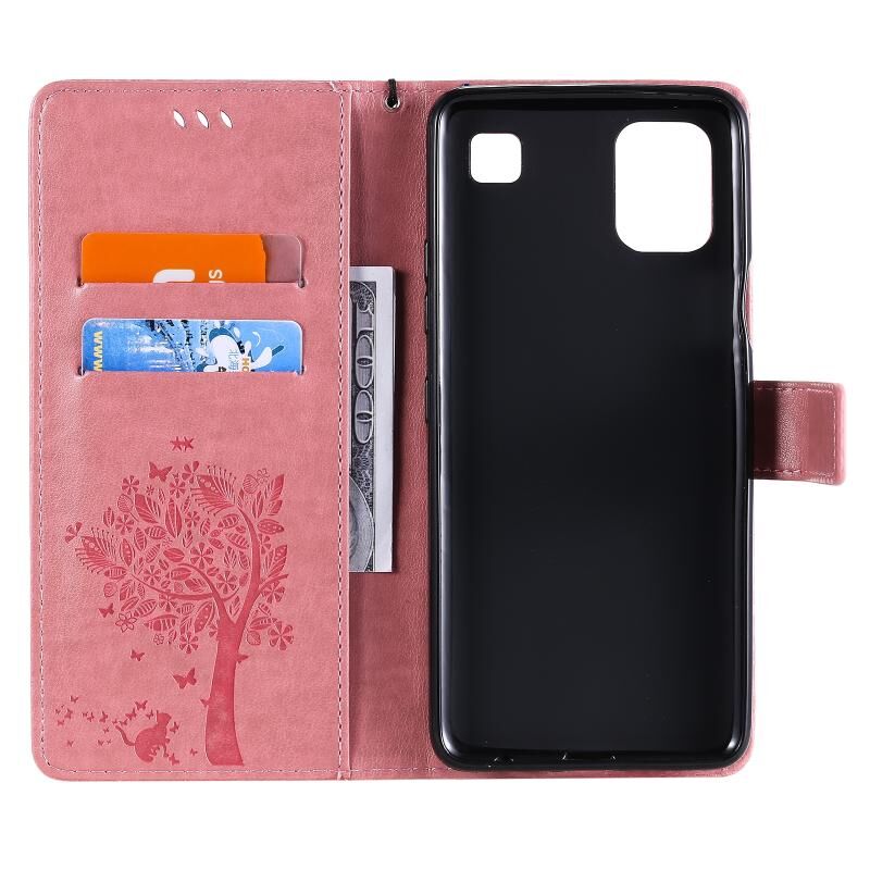 For LG K92 5G Tree & Cat Pattern Pressed Printing Horizontal Flip PU Leather Case with Holder & Card Slots & Wallet & Lanyard(Pink)
