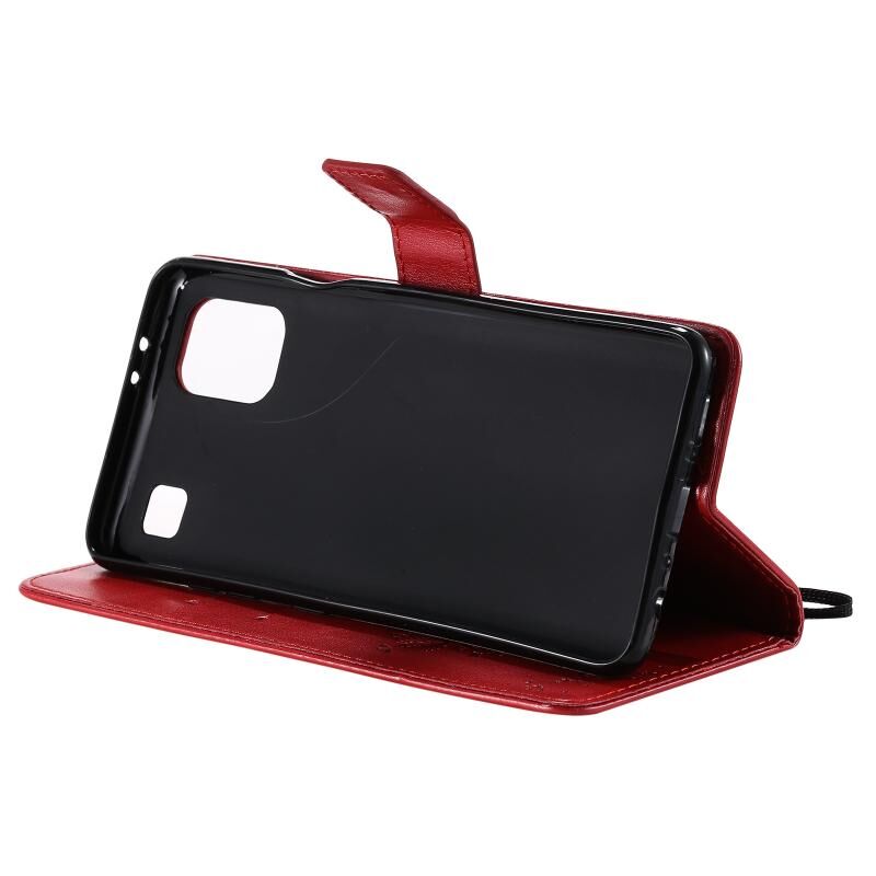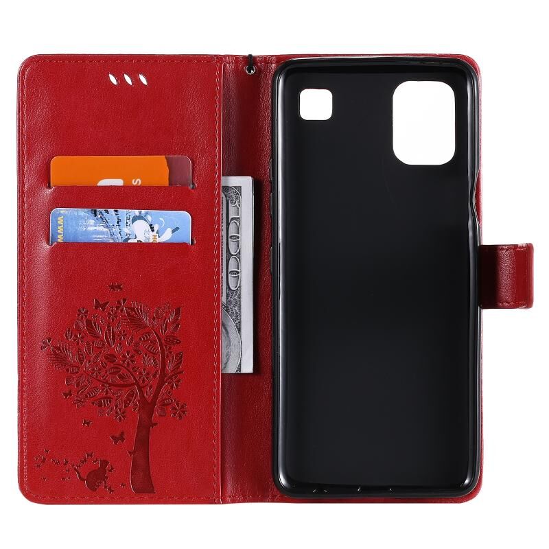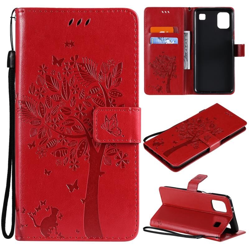 For LG K92 5G Tree & Cat Pattern Pressed Printing Horizontal Flip PU Leather Case with Holder & Card Slots & Wallet & Lanyard(Red)