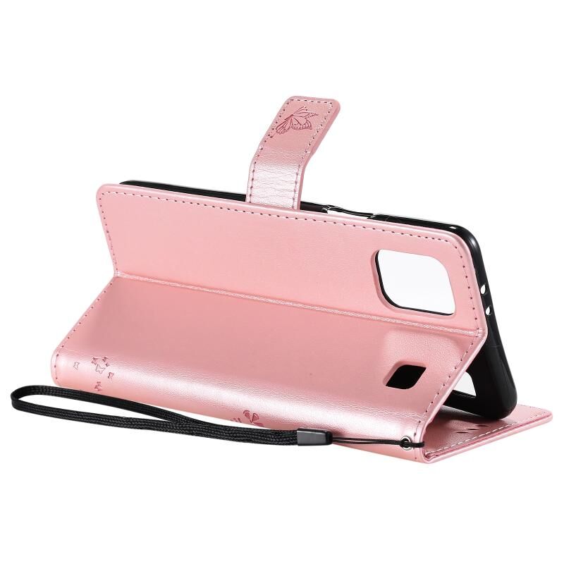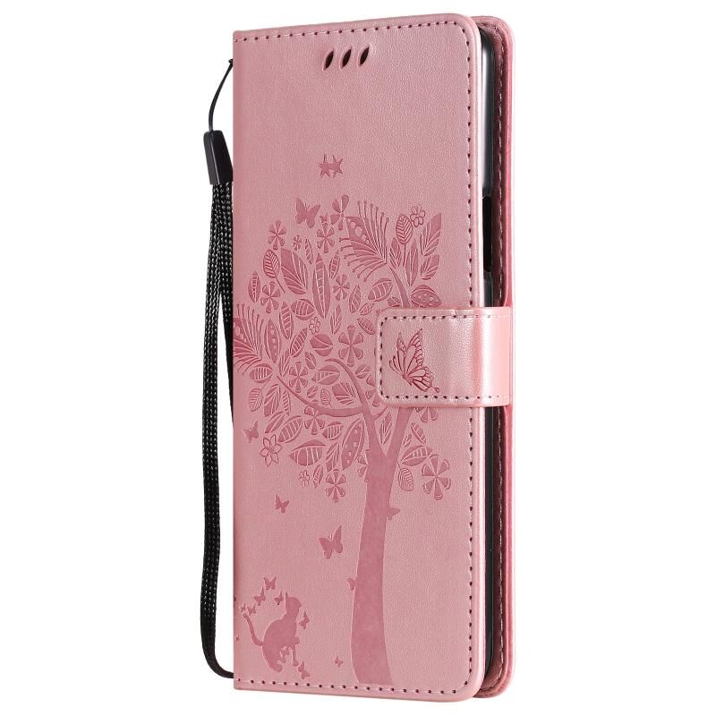 For LG K92 5G Tree & Cat Pattern Pressed Printing Horizontal Flip PU Leather Case with Holder & Card Slots & Wallet & Lanyard(Rose Gold)