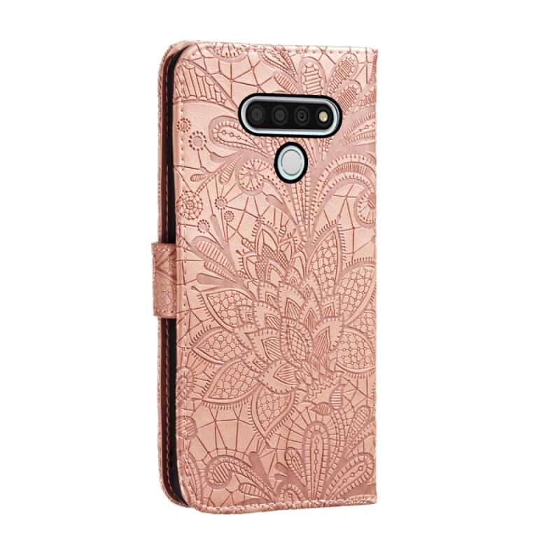 Για LG Q Stylo 6 Lace Flower Οριζόντια Flip δερμάτινη θήκη με θήκη & υποδοχές για κάρτες & πορτοφόλι & κορνίζα φωτογραφιών (Rose Gold)