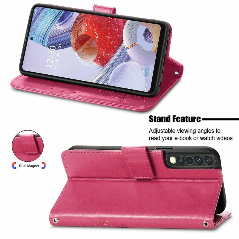 Για το LG Stylo 7 4G Four-leaf Clasp ανάγλυφη αγκράφα Κινητό τηλέφωνο προστασία δερμάτινη θήκη με κορδόνι & υποδοχή για κάρτες & πορτοφόλι & βραχίονα λειτουργία (Magenta)