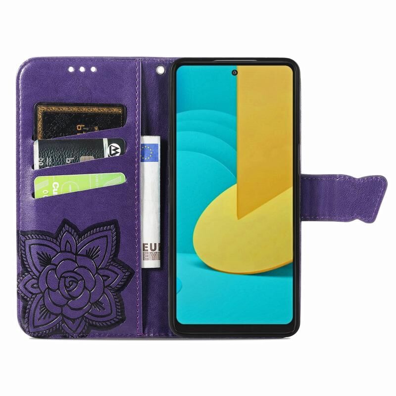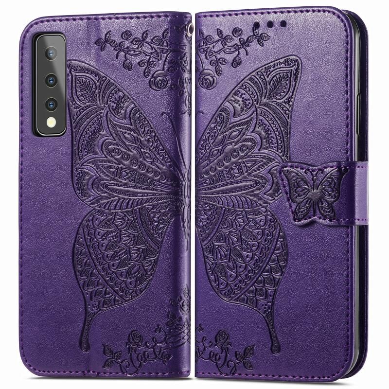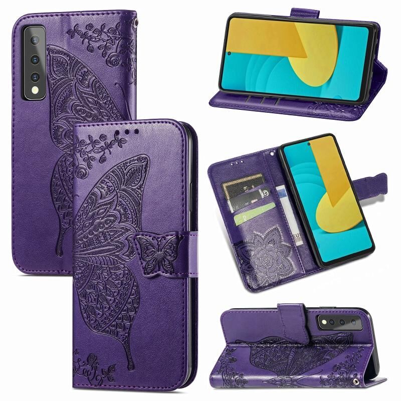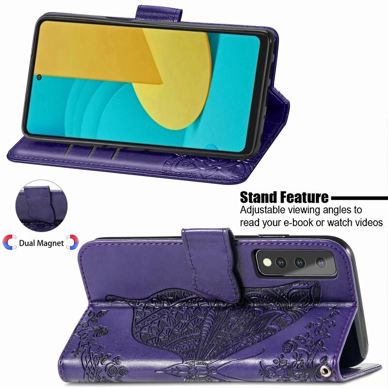 Για LG Stylo 7 5G πεταλούδα αγάπη λουλούδι ανάγλυφο οριζόντια Flip δερμάτινη θήκη με βραχίονα & υποδοχή για κάρτες & πορτοφόλι & κορδόνι (σκούρο μωβ)