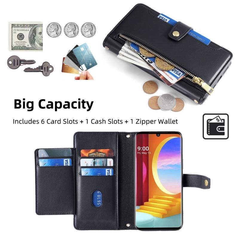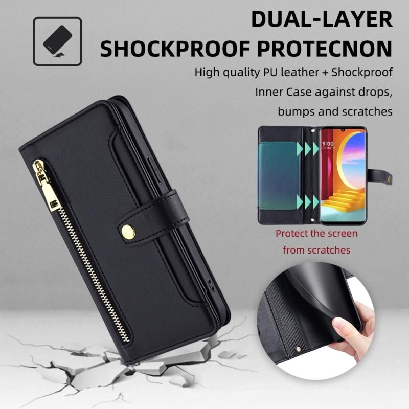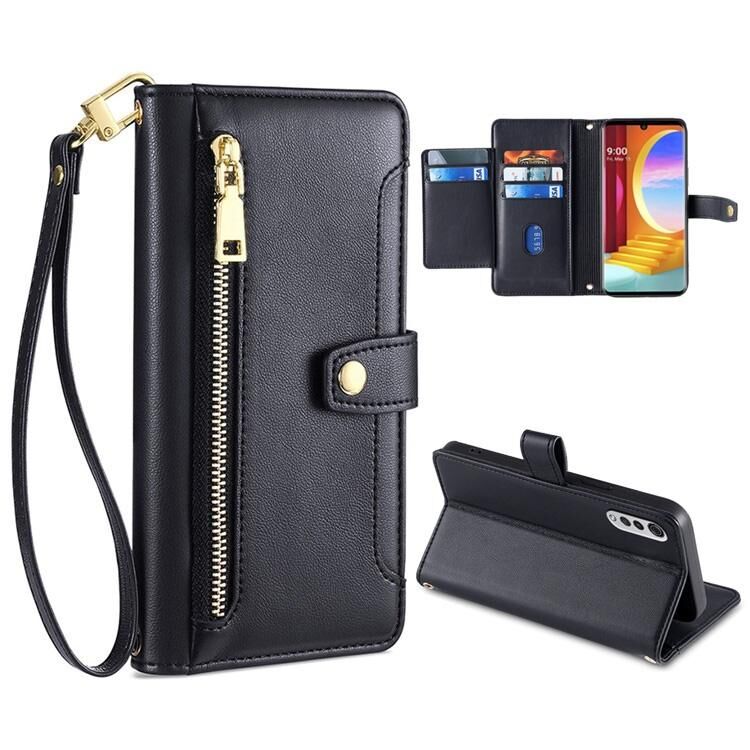 Θήκη τηλεφώνου δερμάτινη με υφή προβάτου, διασχίζουσα, με φερμουάρ και θήκη πορτοφολιού για LG Velvet (Μαύρο)