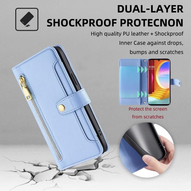 Θήκη τηλεφώνου δερμάτινη με υφή προβάτου, διασχίζουσα, με φερμουάρ και θήκη πορτοφολιού για LG Velvet (Μαύρο)