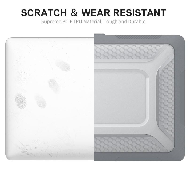 3. Θήκη δύο τεμαχίων, εύκολη στην εγκατάσταση και αφαίρεση· τέσσερα λαστιχένια ποδαράκια κρατούν τον φορητό υπολογιστή σταθερό και ασφαλή· το κάτω κέλυφος είναι αεριζόμενο για να διευκολύνει τη διάχυση της θερμότητας.