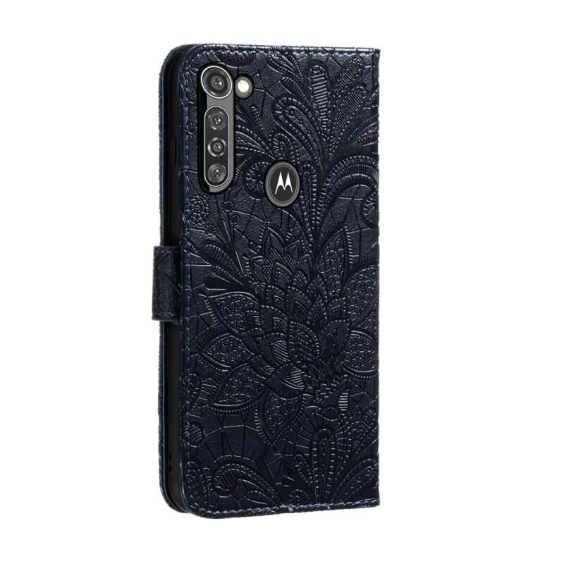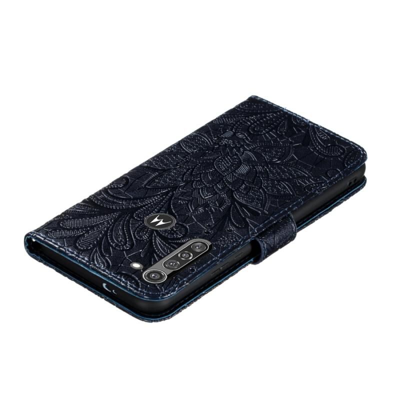 Θήκη για Moto G8 Power με σχέδιο δαντέλας λουλουδιών, ανάγλυφο, οριζόντια, από δέρμα με βάση στήριξης & θήκες καρτών & πορτοφόλι & κορνίζα φωτογραφιών & κορδόνι (Σκούρο Μπλε)