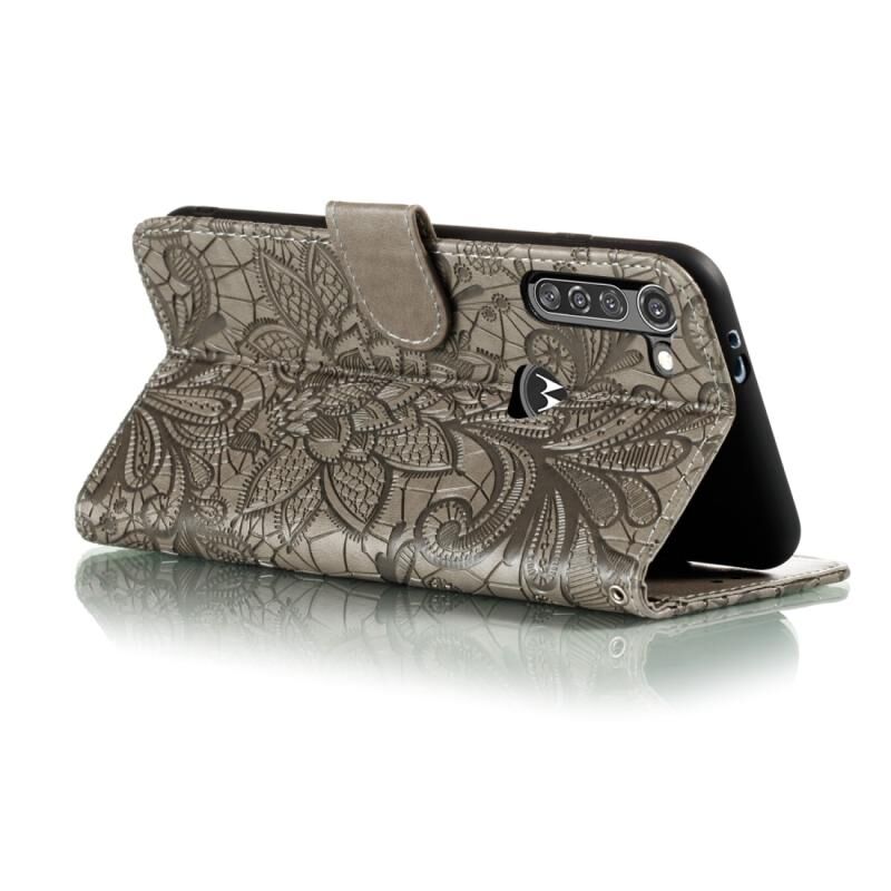 Θήκη για Moto G8 Power με σχέδιο δαντέλας λουλουδιών, ανάγλυφο, οριζόντια, από δέρμα με βάση στήριξης & θήκες καρτών & πορτοφόλι & κορνίζα φωτογραφιών & κορδόνι (Σκούρο Μπλε)