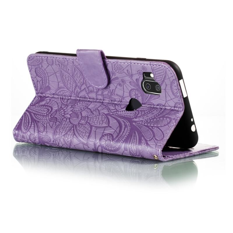 Θήκη για Moto One Hyper με σχέδιο δαντέλας λουλουδιών, ανάγλυφο, οριζόντια, από δέρμα με βάση στήριξης & υποδοχές καρτών & πορτοφόλι & κορνίζα φωτογραφιών & κορδόνι (Σκούρο Μπλε)