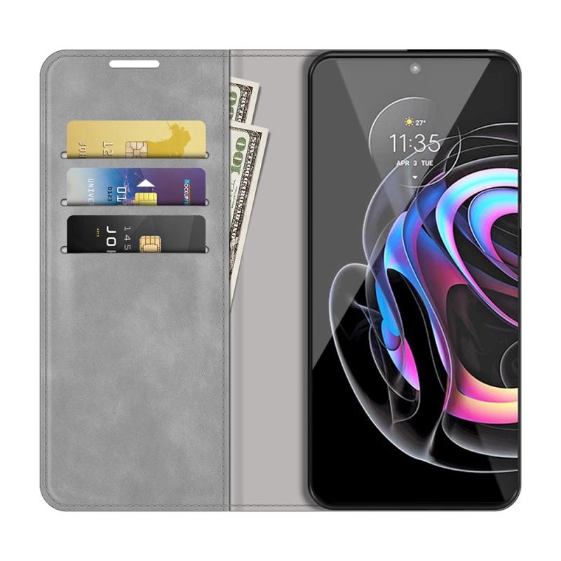 For Motorola Edge 20 Pro Retro-skin Business Magnetic Suction Phone Leather Case with Holder & Card Slots & Wallet(Grey)