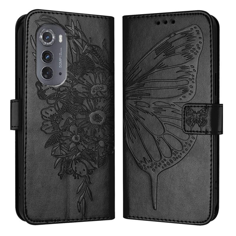 Για Motorola Edge 2022 / Edge + 5G UW 2022 ανάγλυφη πεταλούδα δερμάτινη θήκη τηλεφώνου (μαύρο)