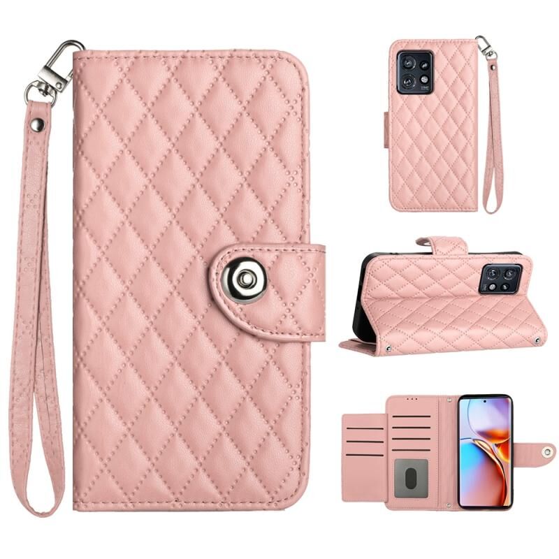 Για Motorola Edge + 2023 Rhombic Texture Flip δερμάτινη θήκη τηλεφώνου με κορδόνι (Coral Pink)