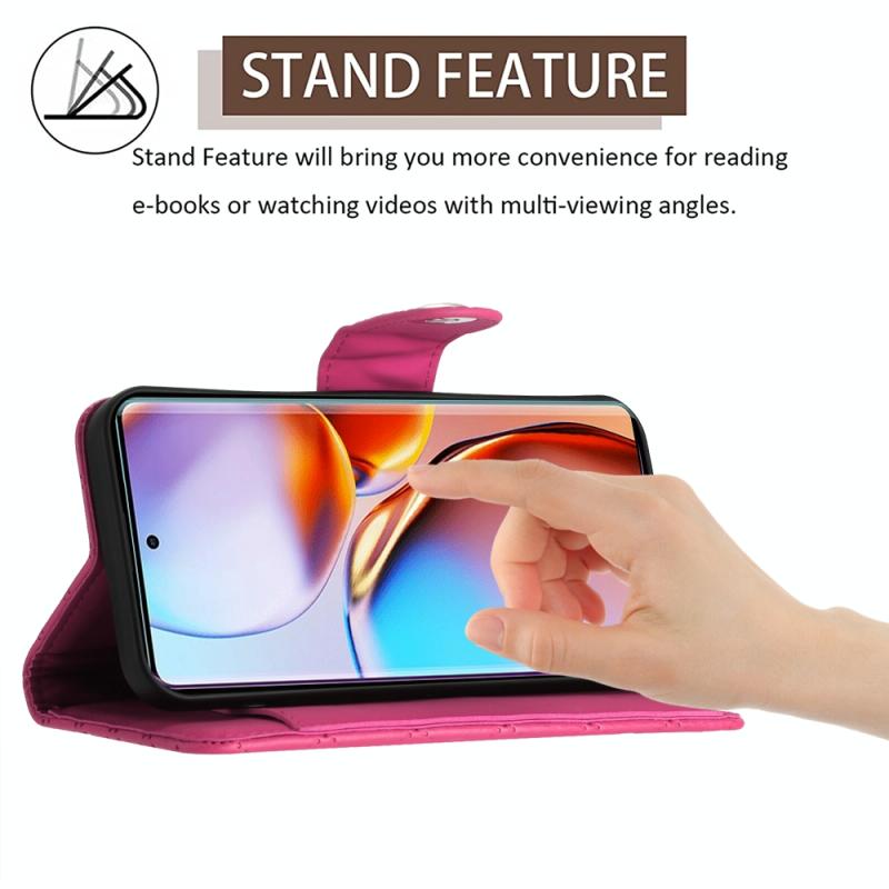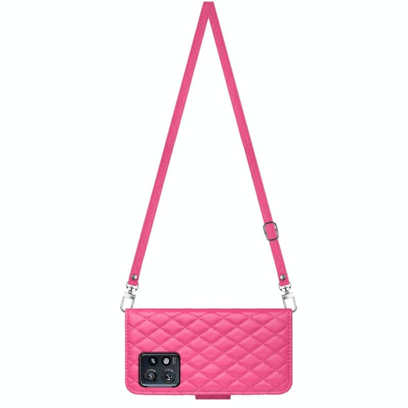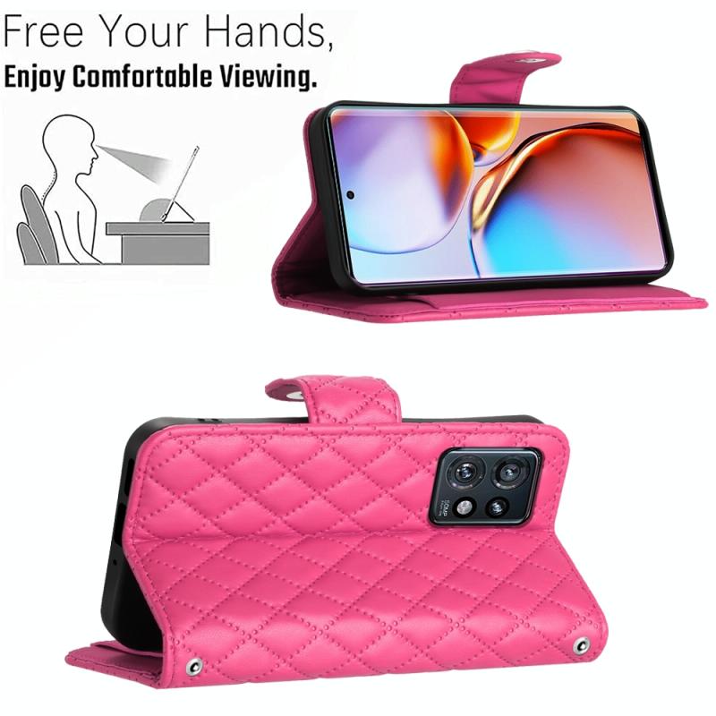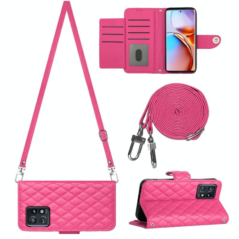 For Motorola Edge+ 2023 Rhombic Texture Flip Leather Phone Case with Long Lanyard(Rose Red)