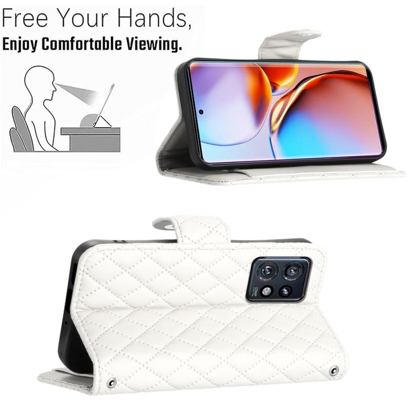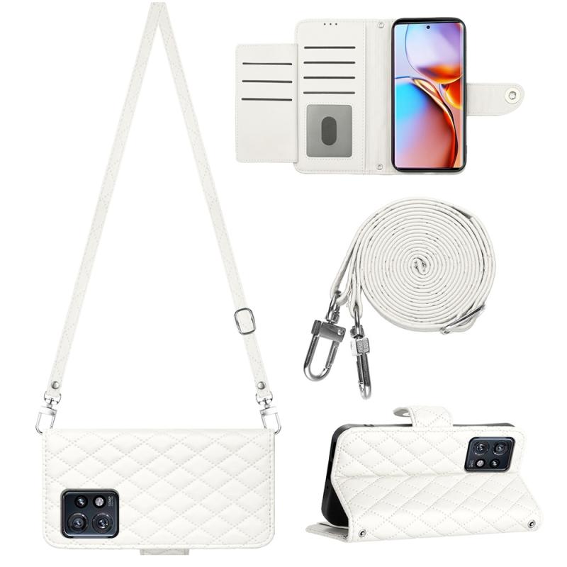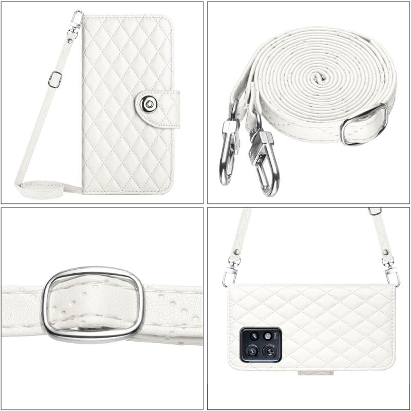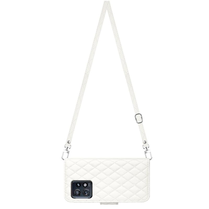 For Motorola Edge+ 2023 Rhombic Texture Flip Leather Phone Case with Long Lanyard(White)