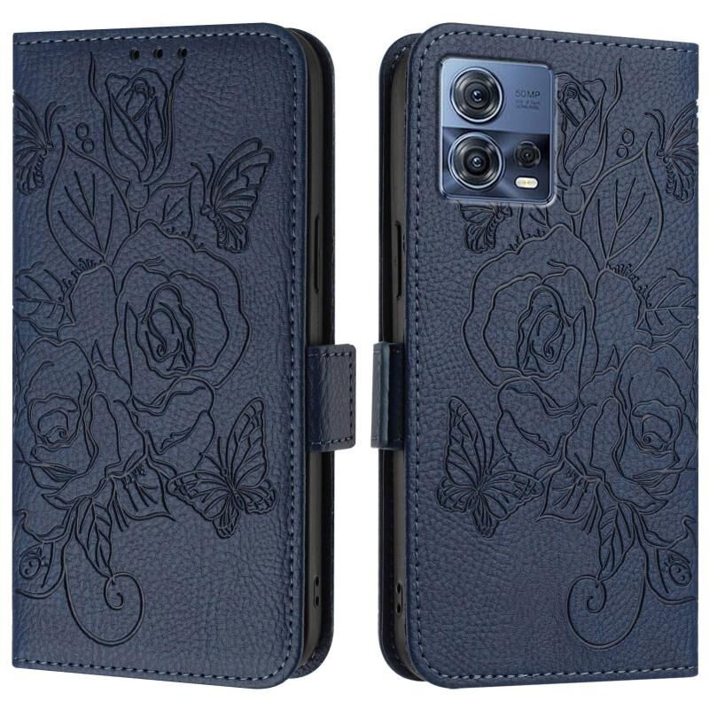 Για Motorola Edge 30 Fusion ανάγλυφο Rose RFID Anti-theft δερμάτινη θήκη τηλεφώνου (σκούρο μπλε)