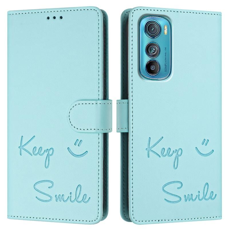 Θήκη κινητού τηλεφώνου δερμάτινη με ανάγλυφο χαμόγελο και RFID για Motorola Edge 30 (Μέντας Πράσινο)