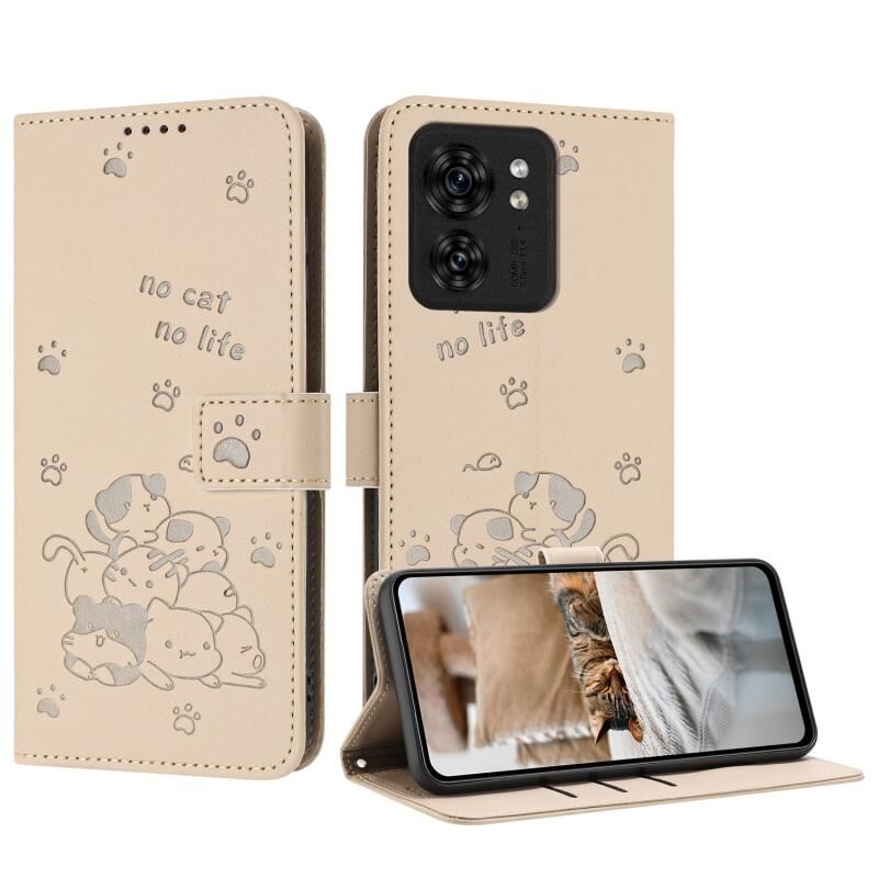 Θήκη δερμάτινη για Motorola Edge 40 με ανάγλυφο σχέδιο γατάκι και λουρί (Μπεζ)
