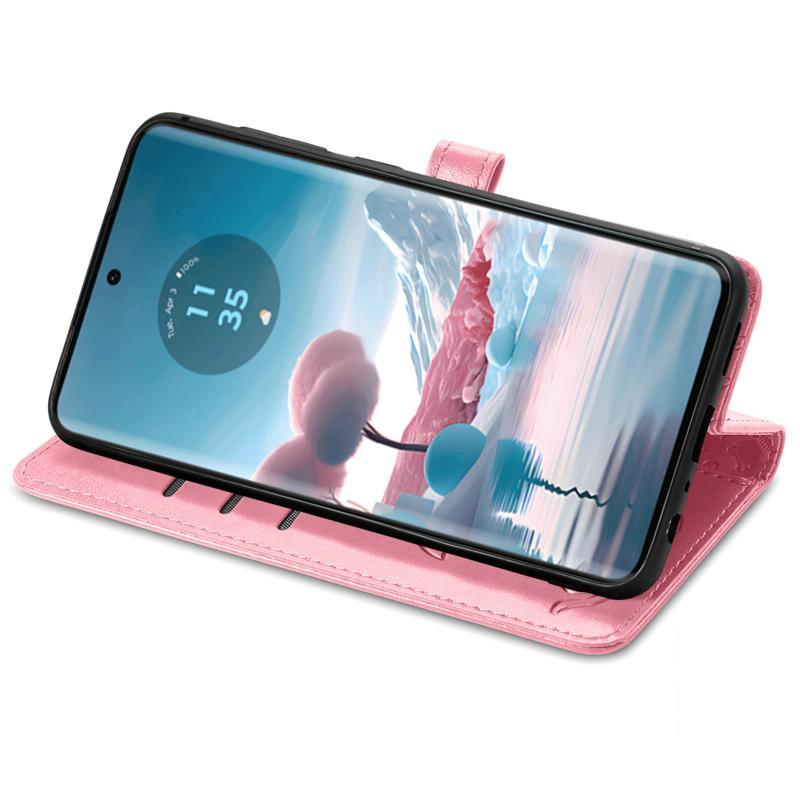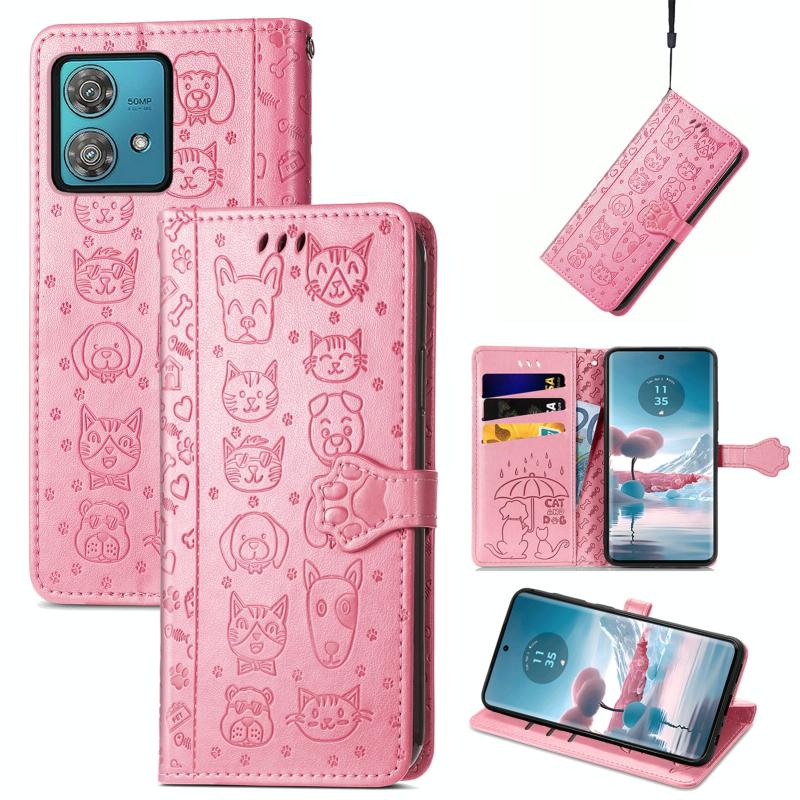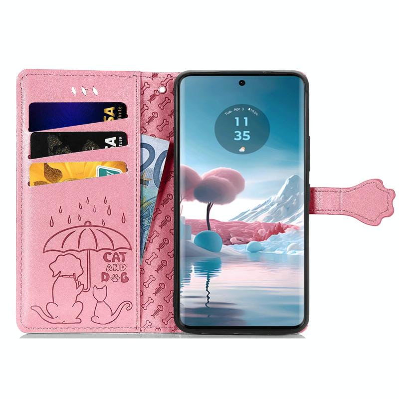 Θήκη Δερμάτινη με Χαρακτά Embossed Γάτας & Σκύλου για Motorola Edge 40 Neo (Ροζ)