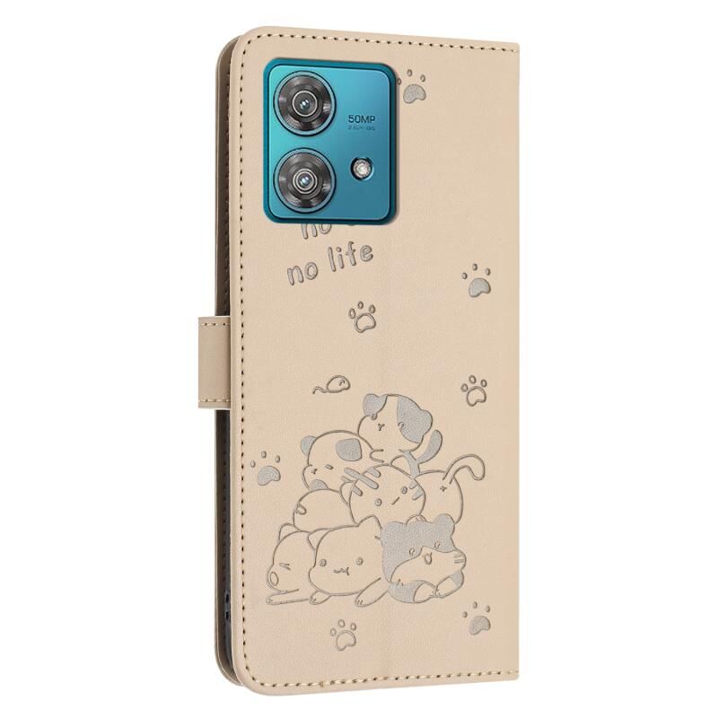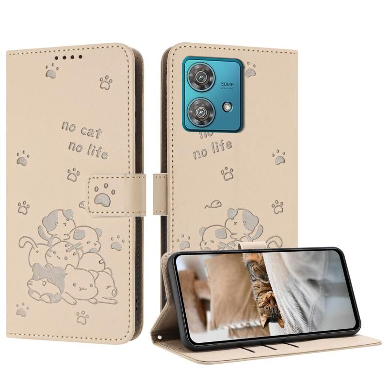 Θήκη δερμάτινη για Motorola Edge 40 Neo με ανάγλυφο σχέδιο γατάκι και λουρί (Μπεζ)