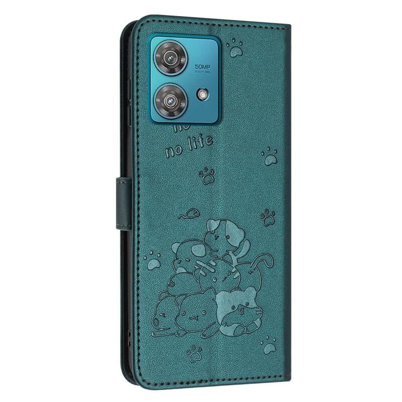 Θήκη δερμάτινη για Motorola Edge 40 Neo με ανάγλυφο σχέδιο γατάκι και λουρί (Μωβ)