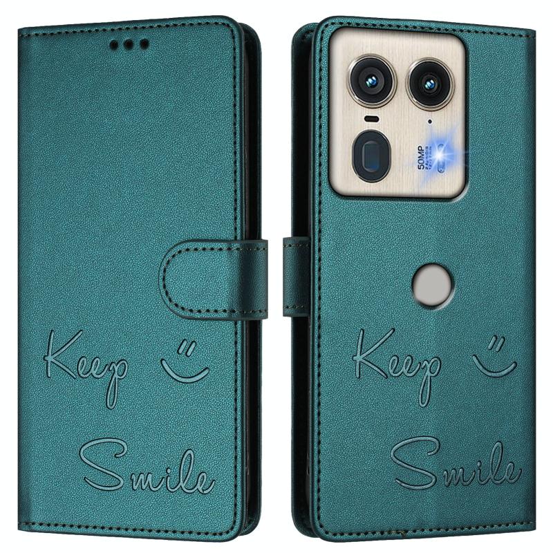 Θήκη τηλεφώνου δερμάτινη με ανάγλυφο χαμόγελο RFID για Motorola Edge 50 5G (Πράσινο Παγωνιού)