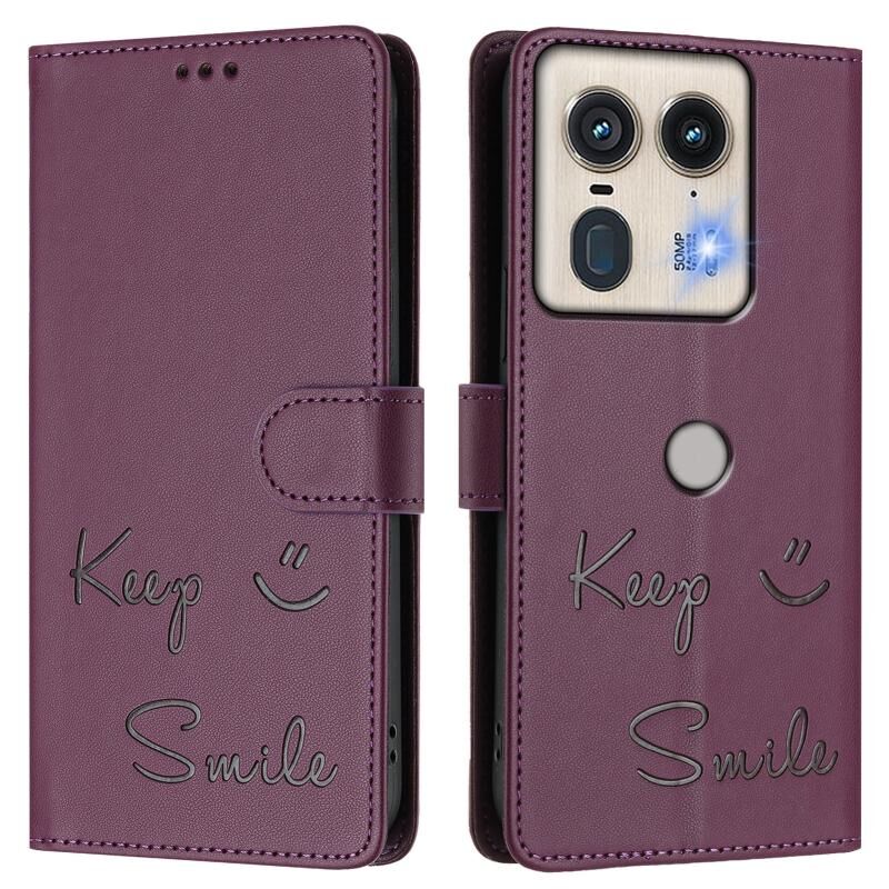 Θήκη τηλεφώνου δερμάτινη με ανάγλυφο χαμόγελο και RFID για Motorola Edge 50 5G (Βιολετί)