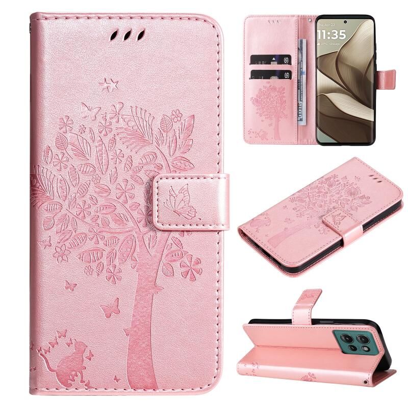 Θήκη τηλεφώνου από δέρμα με σχέδιο αναγλύφου δέντρου & γάτας για Motorola Edge 50 5G (Ροζ)