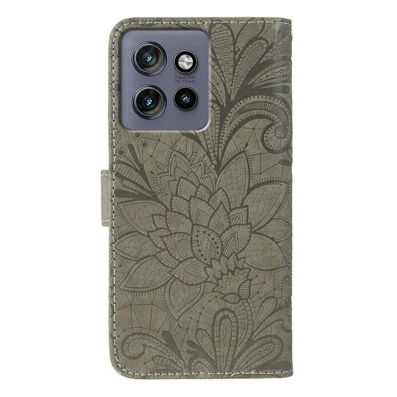 Θήκη τηλεφώνου από δέρμα με πτυσσόμενο καπάκι για Motorola Edge 50 Neo με ανάγλυφο σχέδιο λουλουδιών δαντέλας (Γκρι)