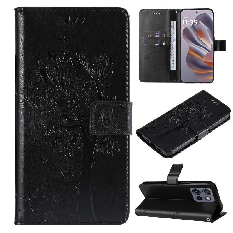 Θήκη τηλεφώνου δερμάτινη, τύπου flip, με ανάγλυφο σχέδιο δέντρου & γάτας για Motorola Edge 50 Neo (Ροζ)