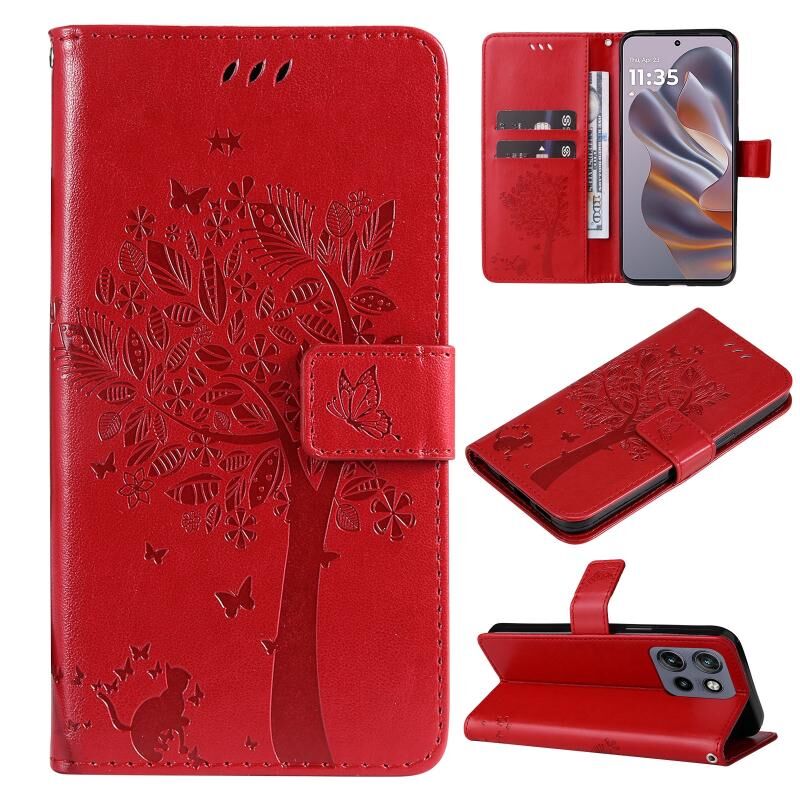 Θήκη τηλεφώνου δερμάτινη, τύπου flip, με ανάγλυφο σχέδιο δέντρου & γάτας για Motorola Edge 50 Neo (Ροζ)