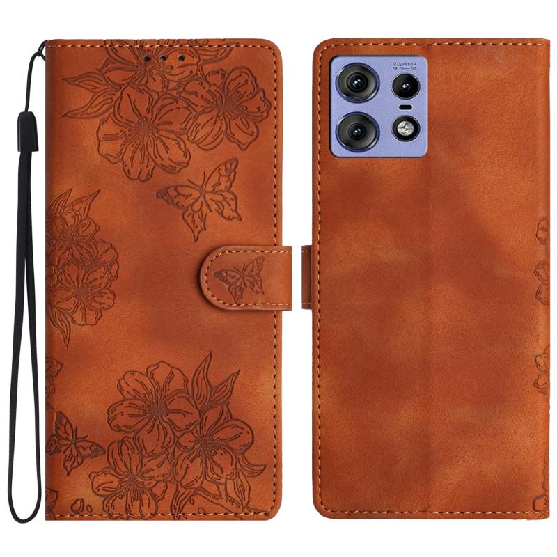 For Motorola Edge 50 Pro Cherry Blossom Butterfly Skin Feel Embossed PU Phone Case(Brown)
