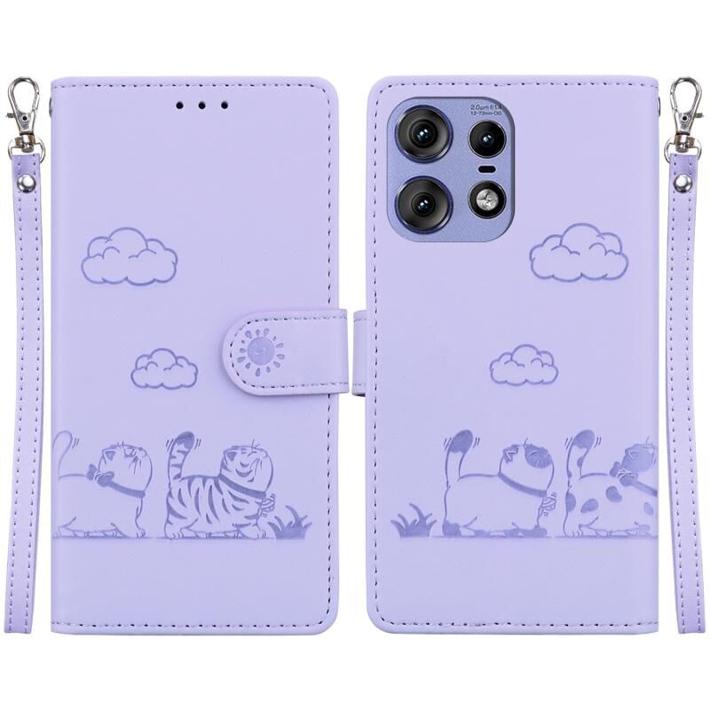 Θήκη τηλεφώνου από δέρμα με χαριτωμένες γάτες και τεχνολογία RFID για Motorola Edge 50 Pro (Μωβ)
