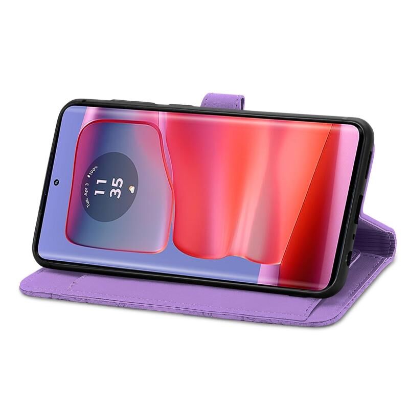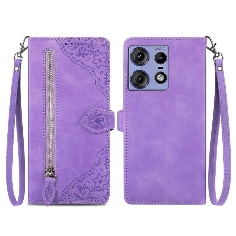Για Motorola Edge 50 Pro ανάγλυφο λουλούδι φερμουάρ δερμάτινη θήκη τηλεφώνου (μωβ)