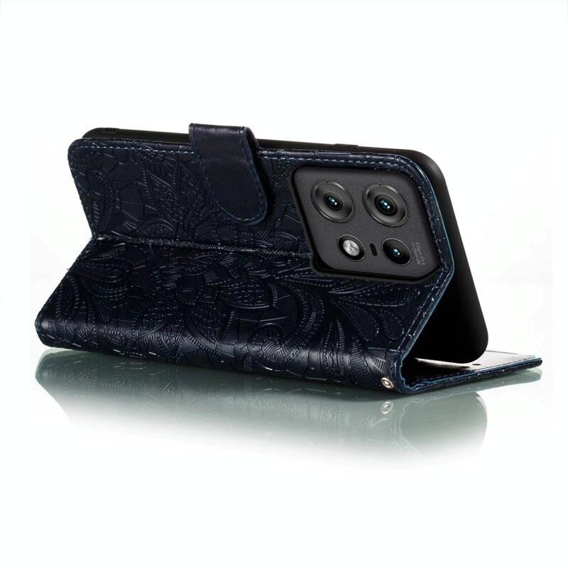Για Motorola Edge 50 Pro Lace λουλούδι ανάγλυφο Flip υπόθεση τηλεφώνου δέρμα (σκούρο μπλε)