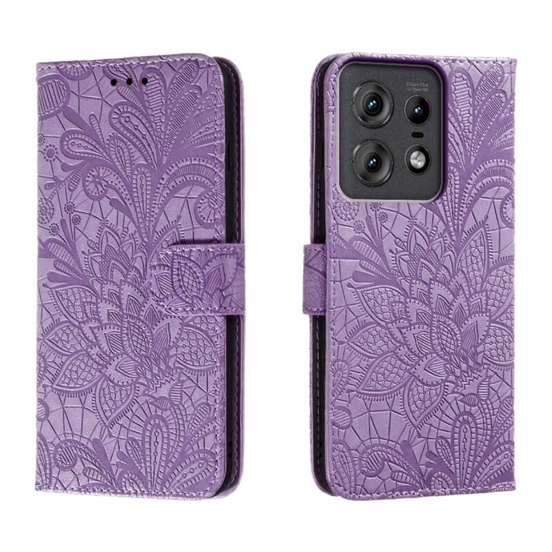 Για Motorola Edge 50 Pro Δαντέλα λουλούδι ανάγλυφο Flip υπόθεση τηλεφώνου δέρμα (μωβ)