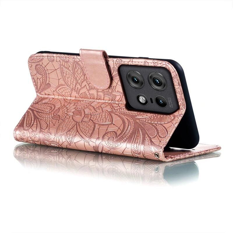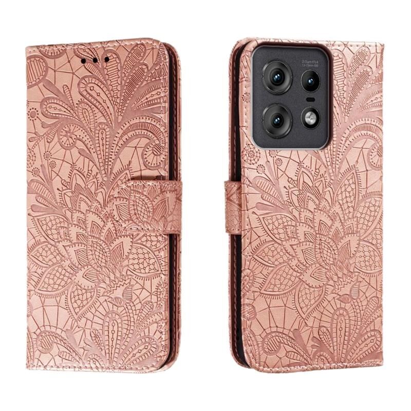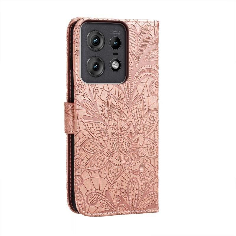 Για Motorola Edge 50 Pro Lace λουλούδι ανάγλυφο Flip υπόθεση τηλεφώνου δέρμα (Ροζ χρυσός)