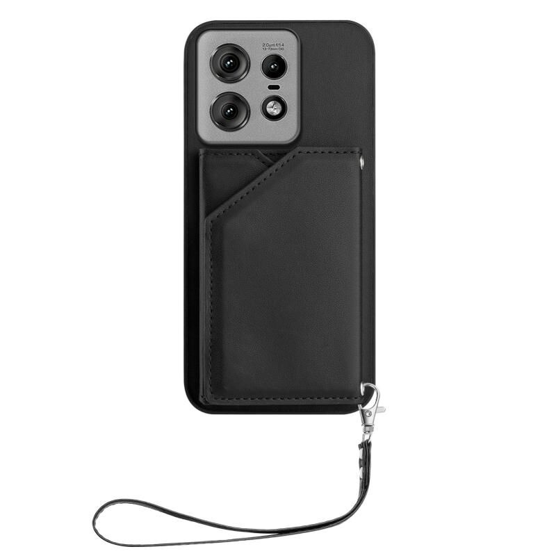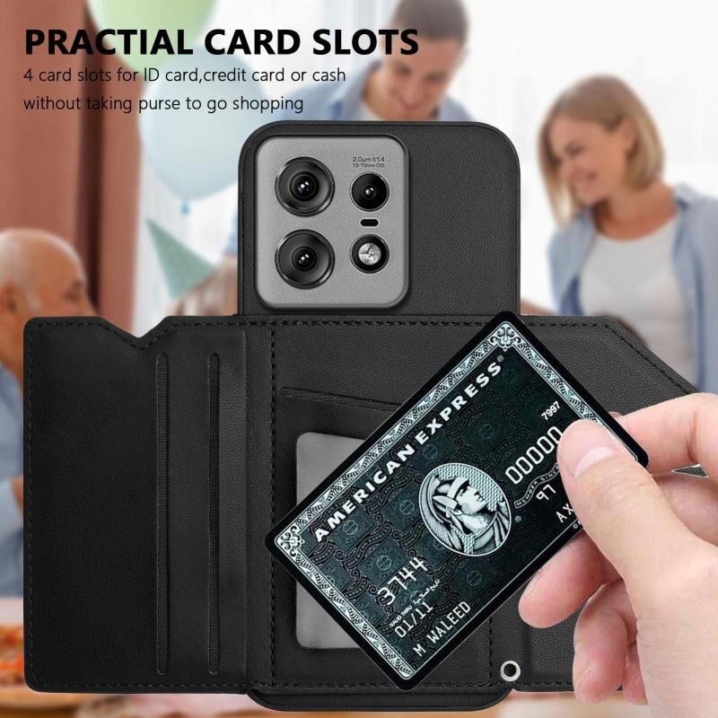 Θήκη κινητού τηλεφώνου για Motorola Edge 50 Pro με αίσθηση δέρματος, τέσσερις θήκες για κάρτες και λουρί καρπού (Μαύρο)