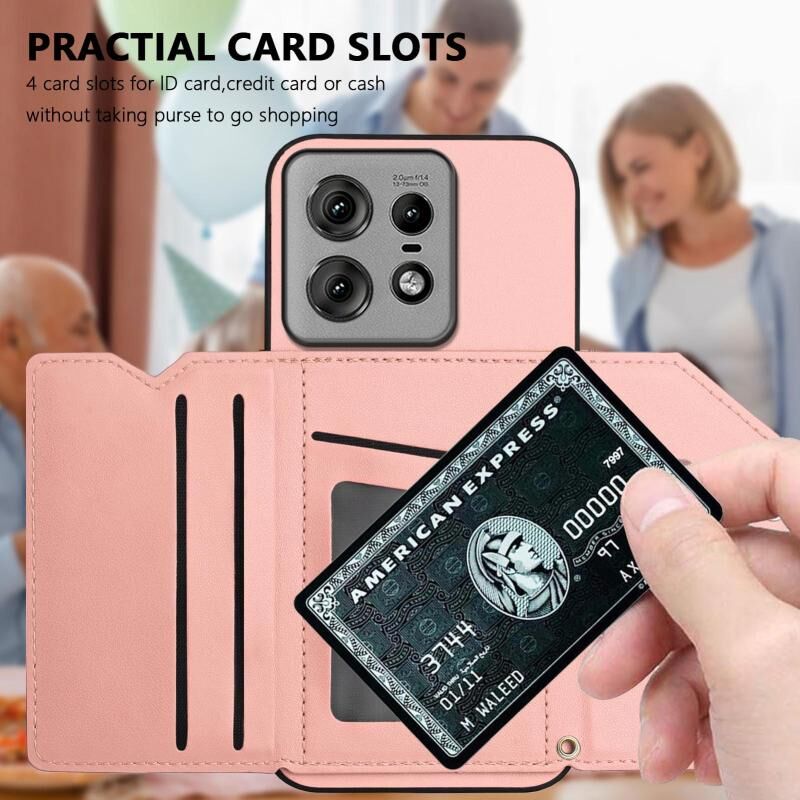Θήκη κινητού τηλεφώνου για Motorola Edge 50 Pro με αίσθηση δέρματος, τέσσερις θήκες για κάρτες και λουρί καρπού (ρόζ)