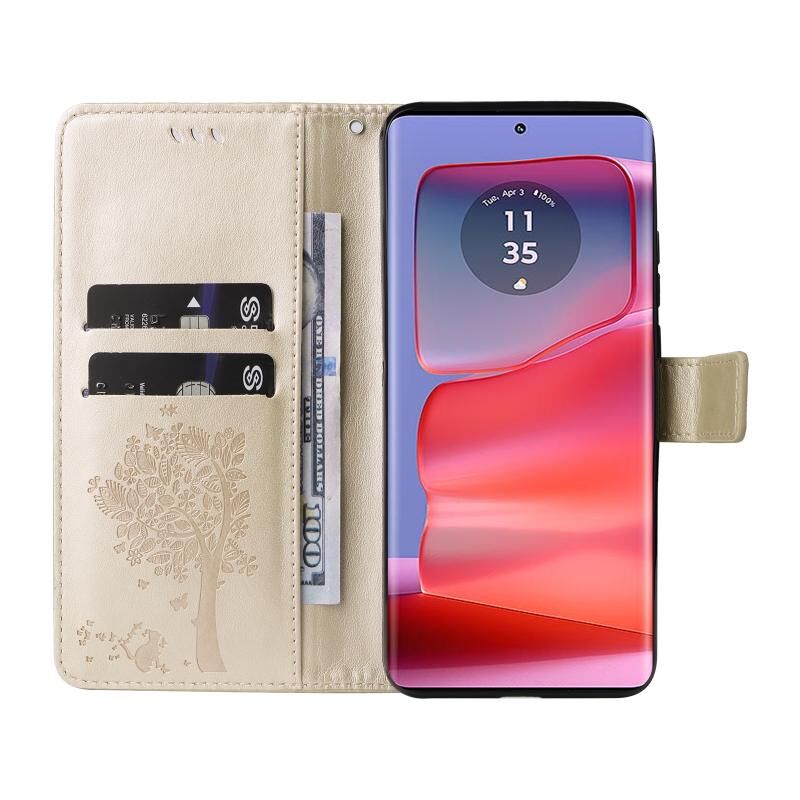 Θήκη τηλεφώνου από δέρμα με σχέδιο αναδιπλής θήκης για Motorola Edge 50 Pro με ανάγλυφο μοτίβο Δέντρου & Γάτας (Ροζ)