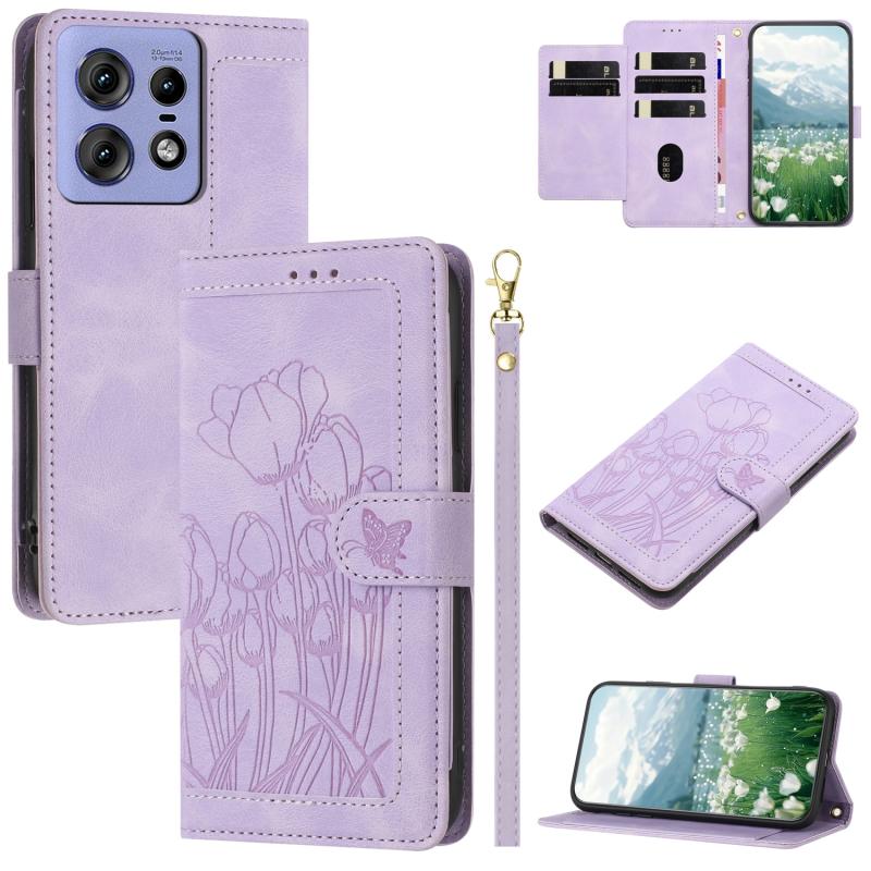 For Motorola Edge 50 Pro Tulips Embossed Leather Phone Case with Lanyard(Purple)