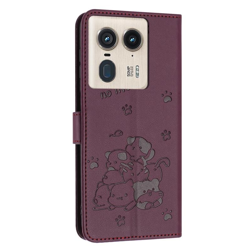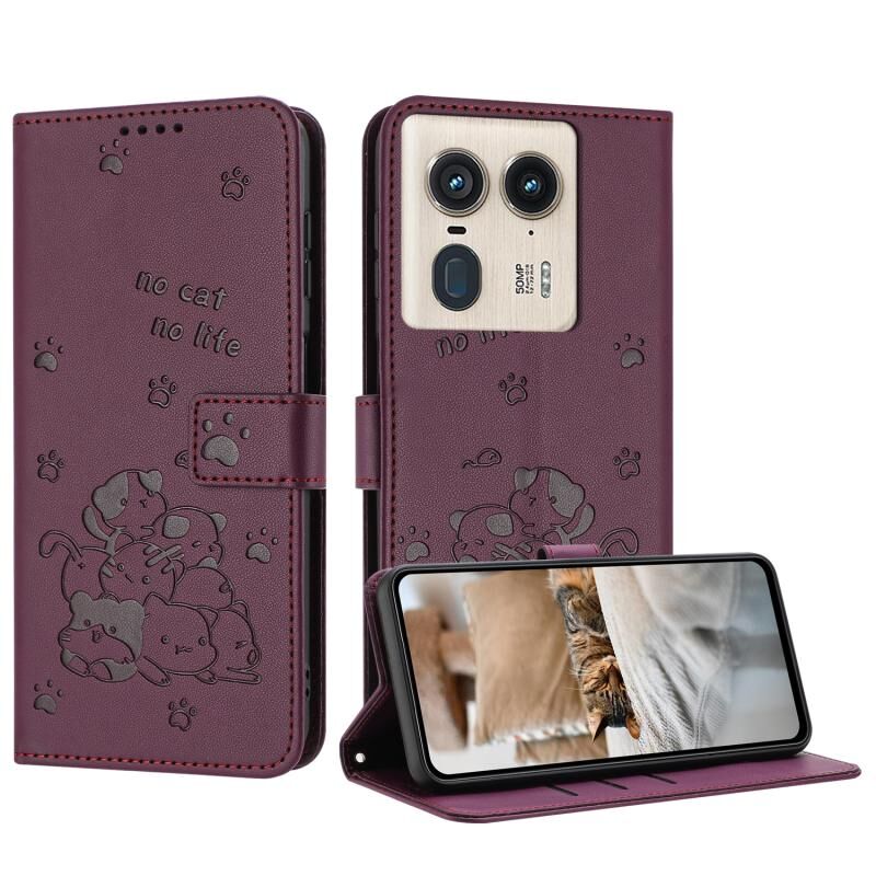 Θήκη δερμάτινη για Motorola Edge 50 Ultra με ανάγλυφο σχέδιο γατάκι και λουρί (Μωβ)