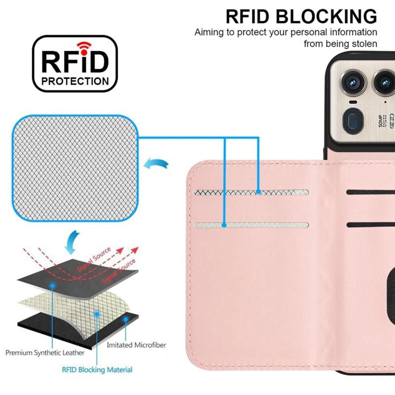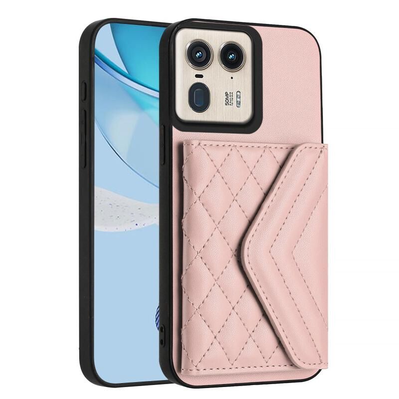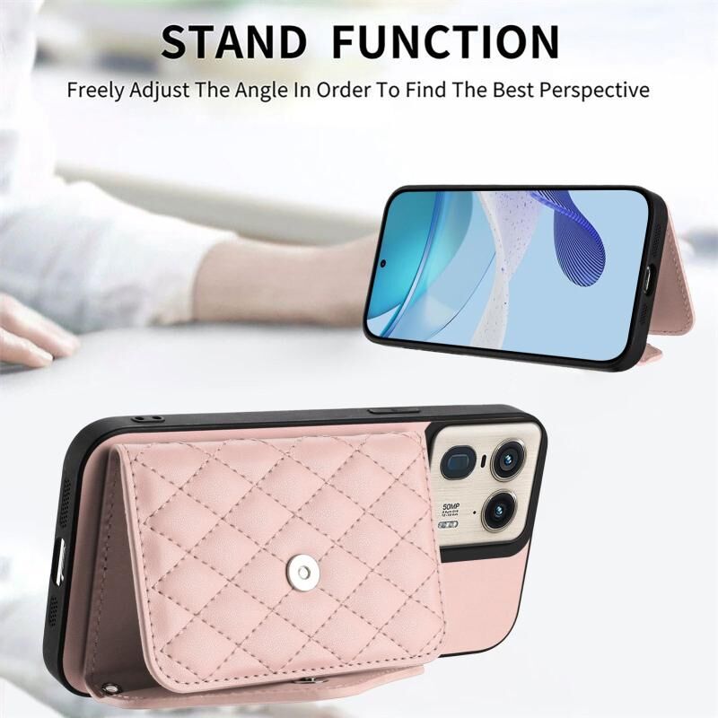 Για Motorola Edge 50 Ultra έκδοση της ΕΕ Ρομβική υφή κάρτα τσάντα RFID υπόθεση τηλεφώνου με μακρύ κορδόνι (Rose Gold)