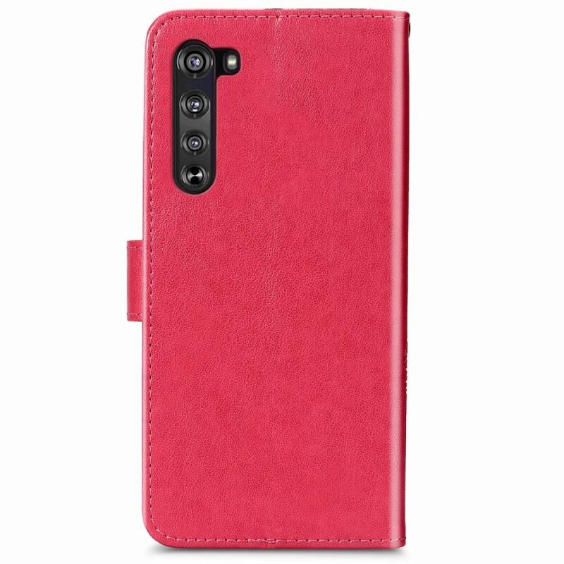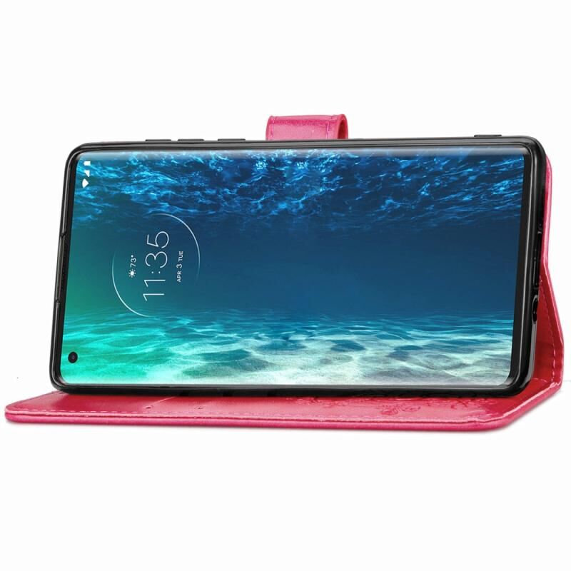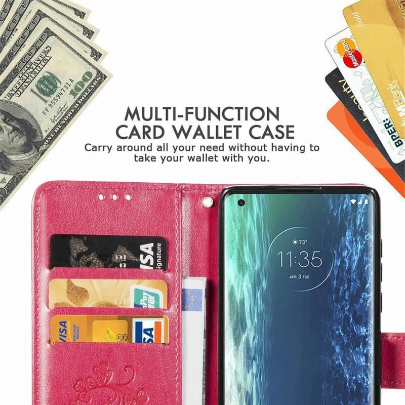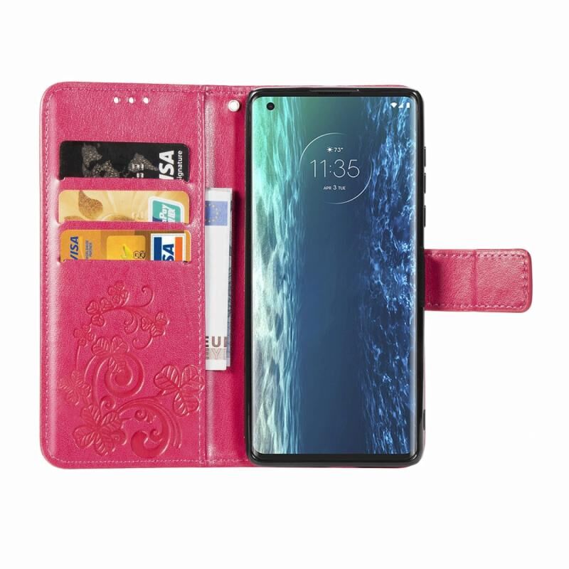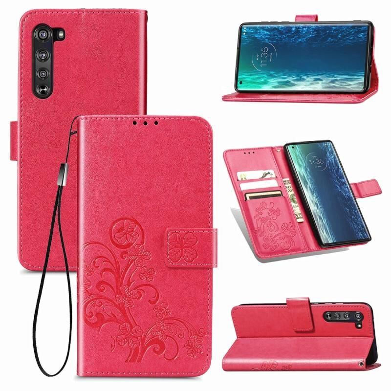 Για Motorola Edge Θήκη κινητού τηλεφώνου από δέρμα με σχέδιο τριφυλλιού, ανάγλυφη αγκράφα, λουρί, θήκη για κάρτες, πορτοφόλι και λειτουργία βάσης στήριξης (ματζέντα)