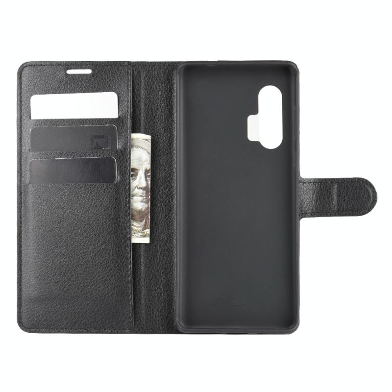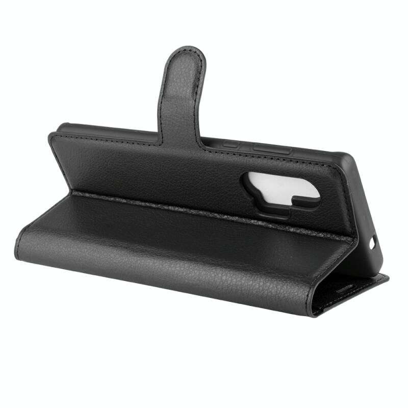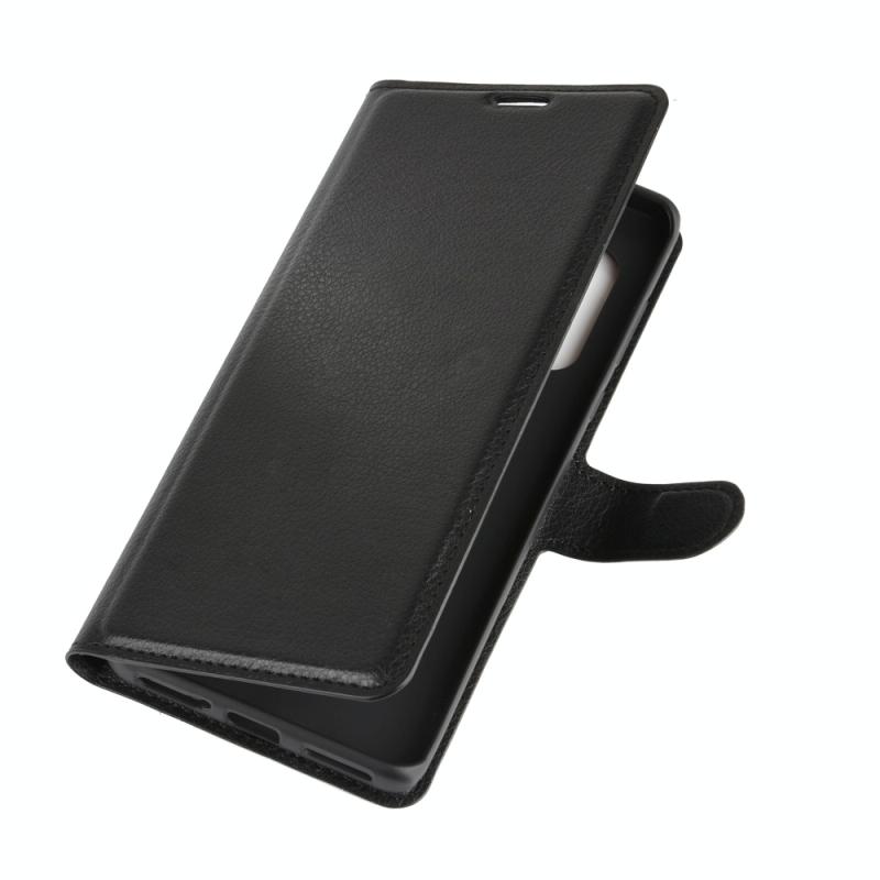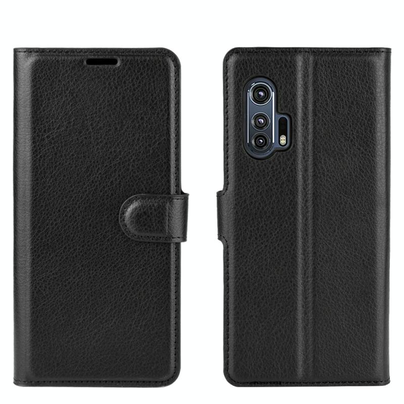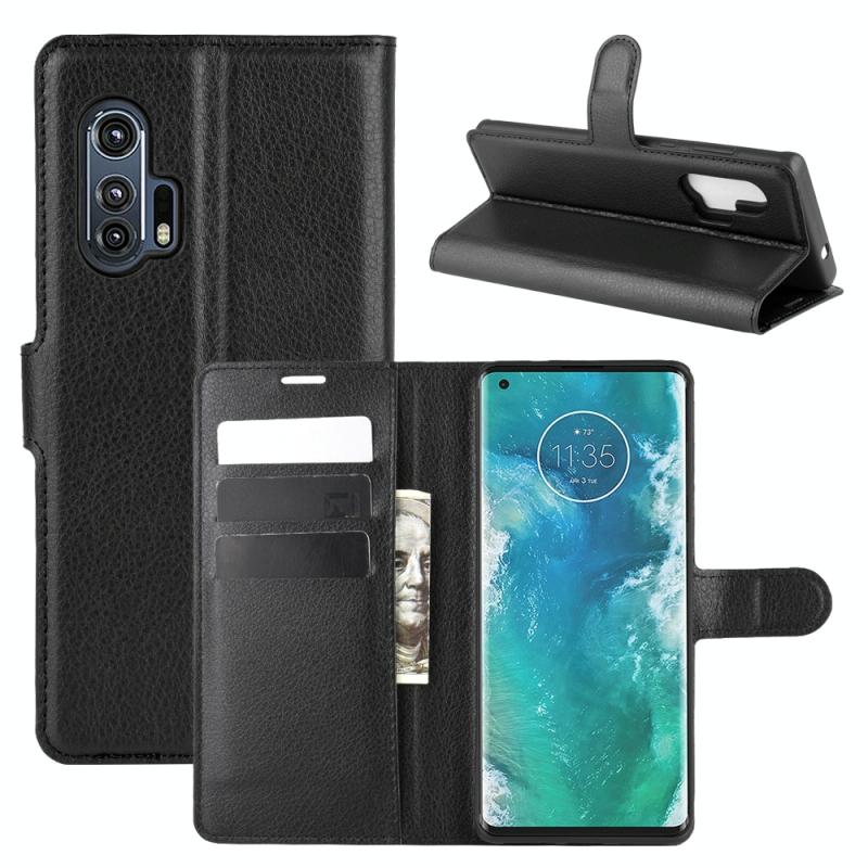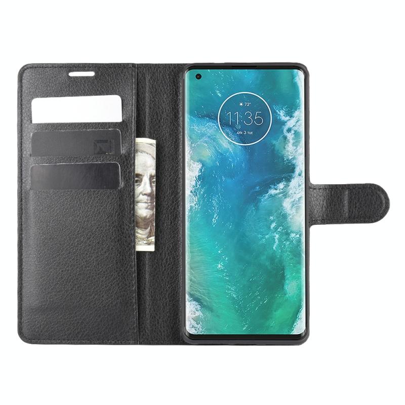Θήκη προστασίας οριζόντιας αναδίπλωσης με υφή Litchi για Motorola Edge+ με βάση στήριξης & υποδοχές καρτών & πορτοφόλι (Μαύρο)