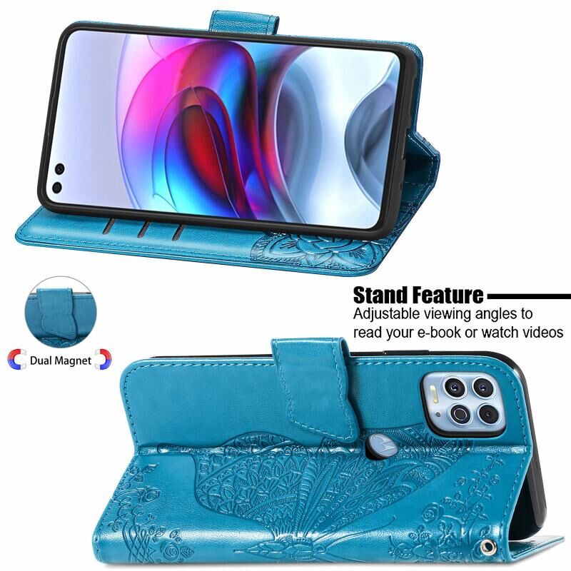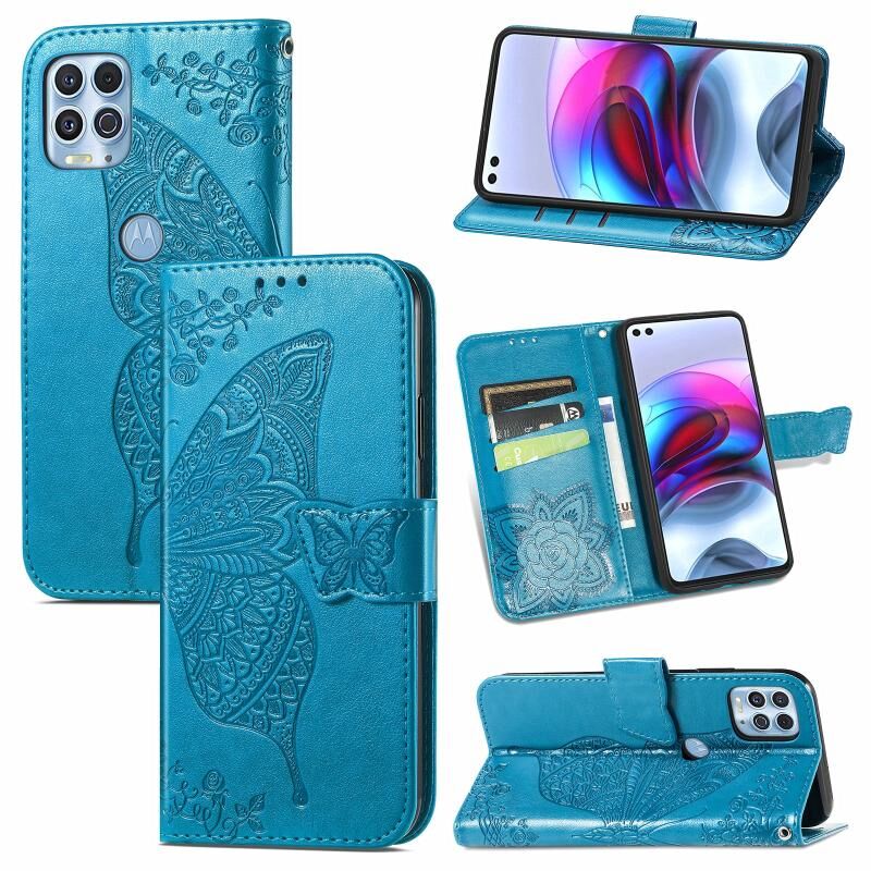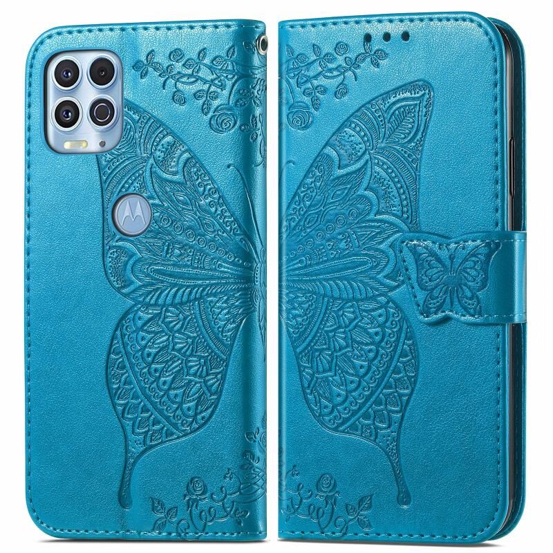 Για Motorola Edge S πεταλούδα αγάπη λουλούδια ανάγλυφο οριζόντια Flip δερμάτινη θήκη με κάτοχο & υποδοχές για κάρτες & πορτοφόλι & κορδόνι (μπλε)
