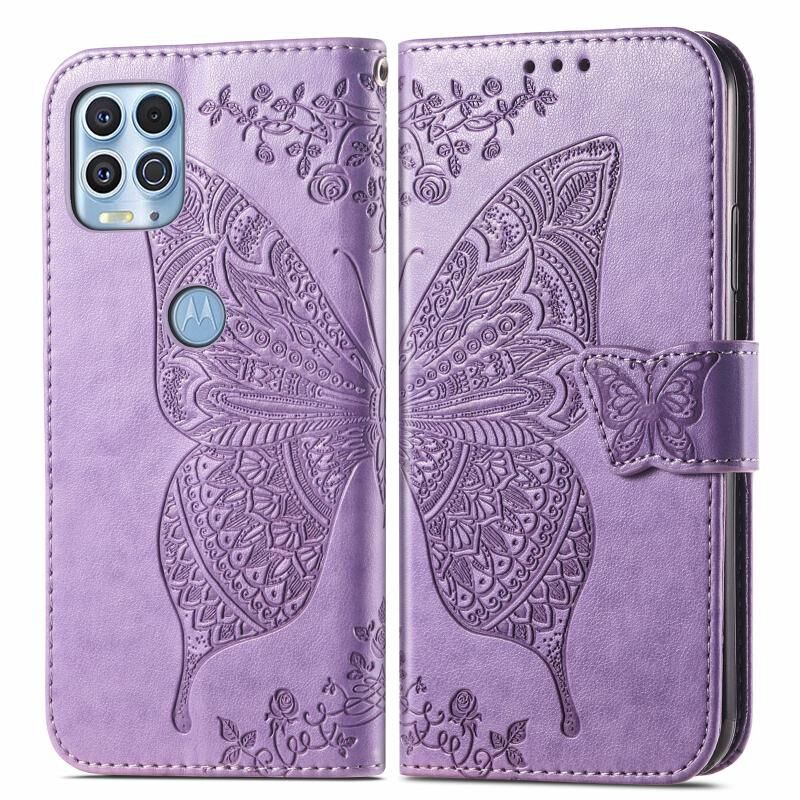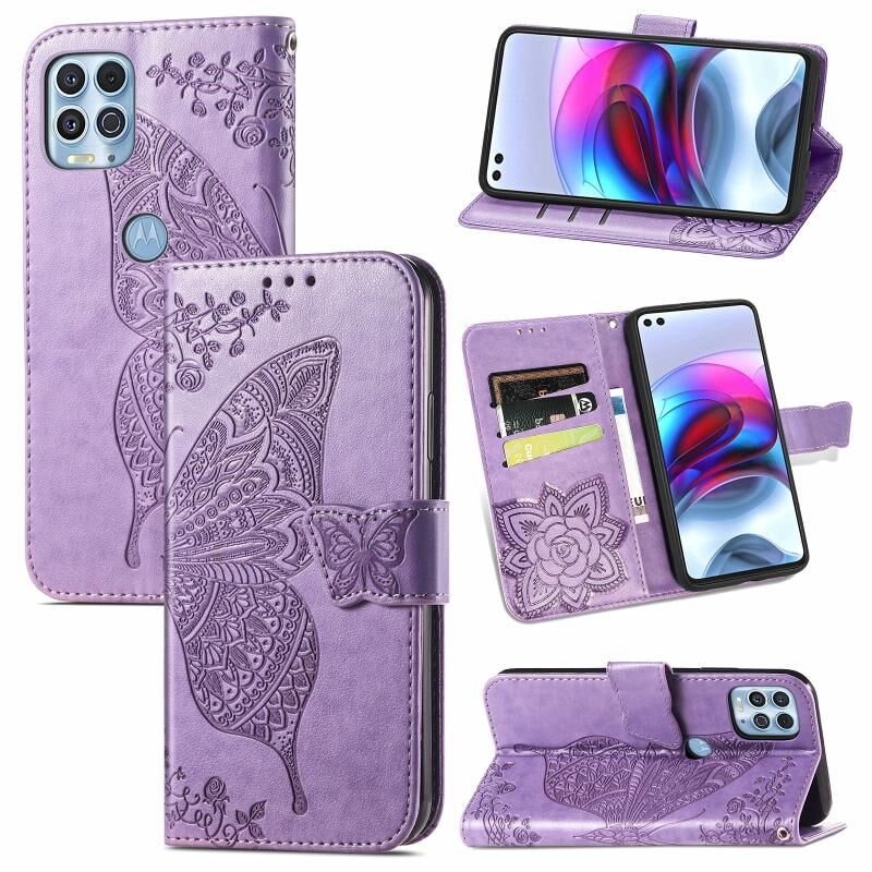 Για Motorola Edge S πεταλούδα αγάπη λουλούδια ανάγλυφο οριζόντια Flip δερμάτινη θήκη με κάτοχο & υποδοχές για κάρτες & πορτοφόλι & κορδόνι (Light Purple)