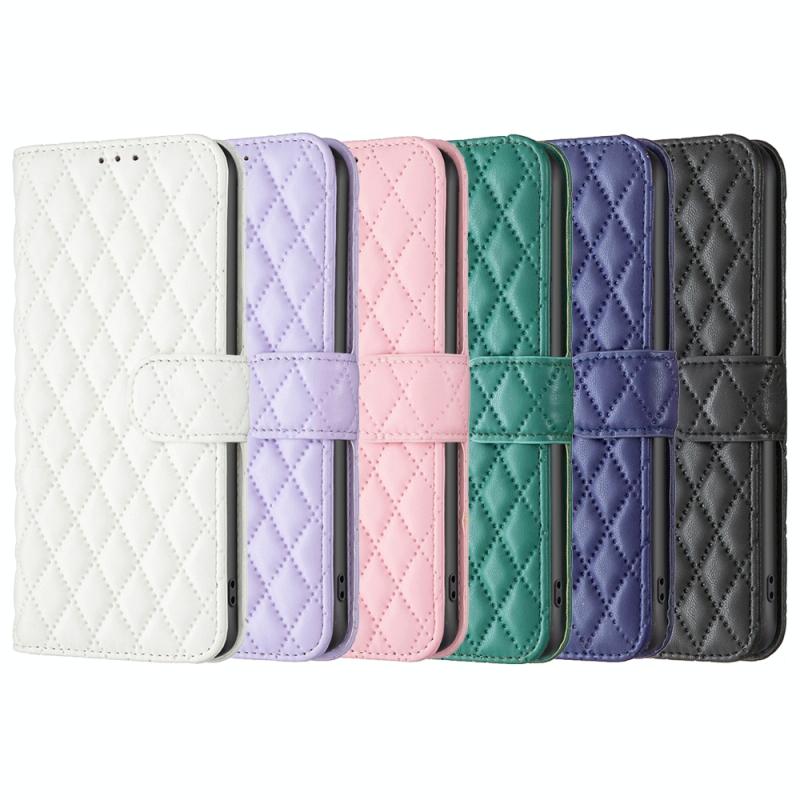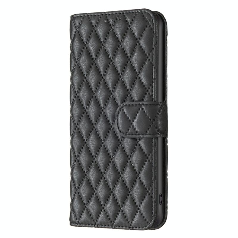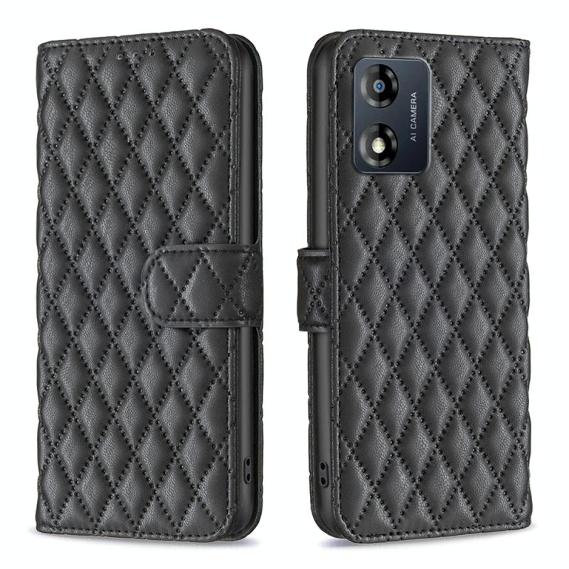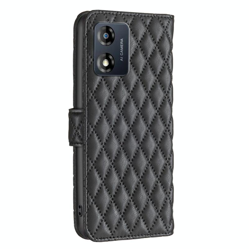 Θήκη κινητού τηλεφώνου τύπου πορτοφολιού με δερμάτινη αναδιπλούμενη επιφάνεια για Motorola Moto E13 4G, με σχέδιο διαμαντοειδούς πλέγματος (Μαύρο)