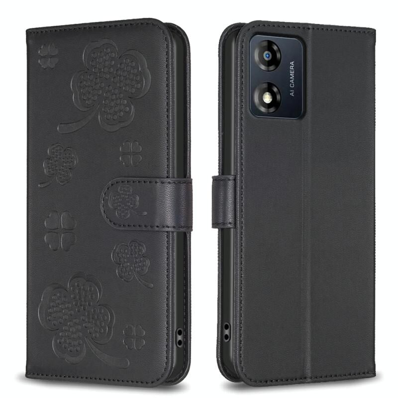 For Motorola Moto E13 4G Four-leaf Embossed Leather Phone Case(Black)