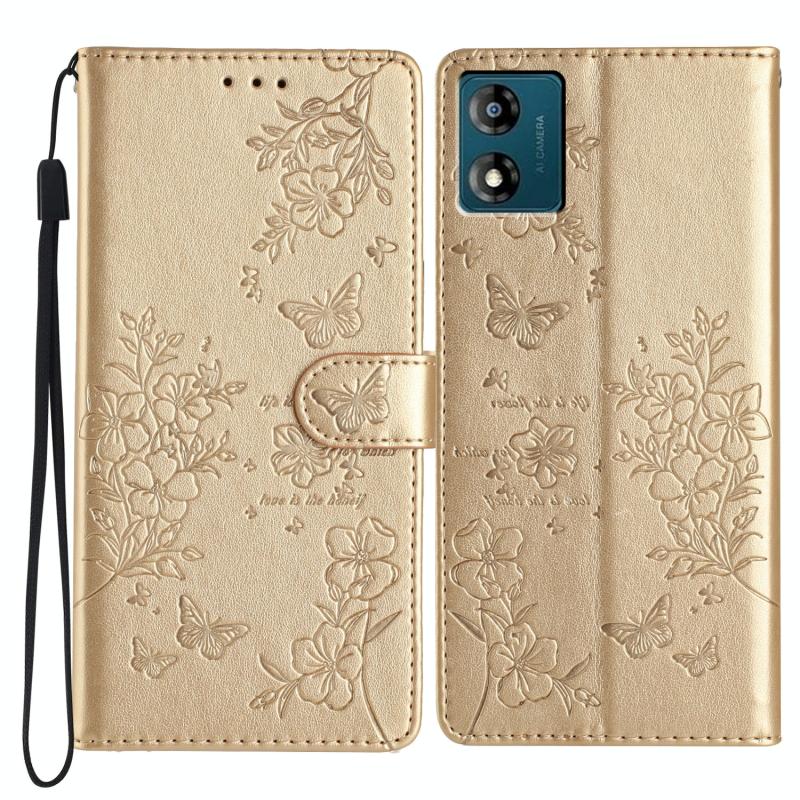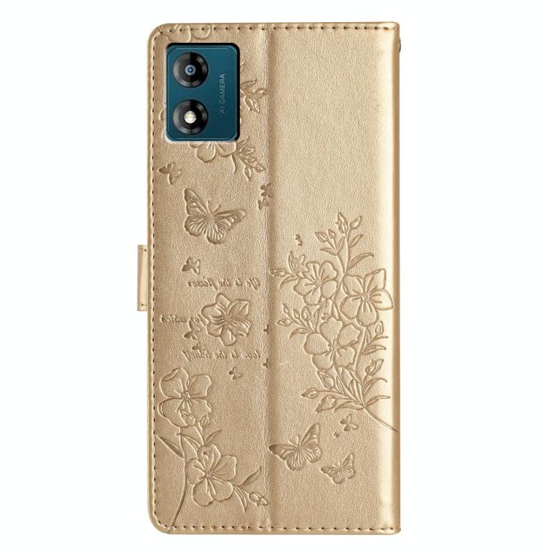 For Motorola Moto E13 Butterflies and Flowers Leather Phone Case(Gold)