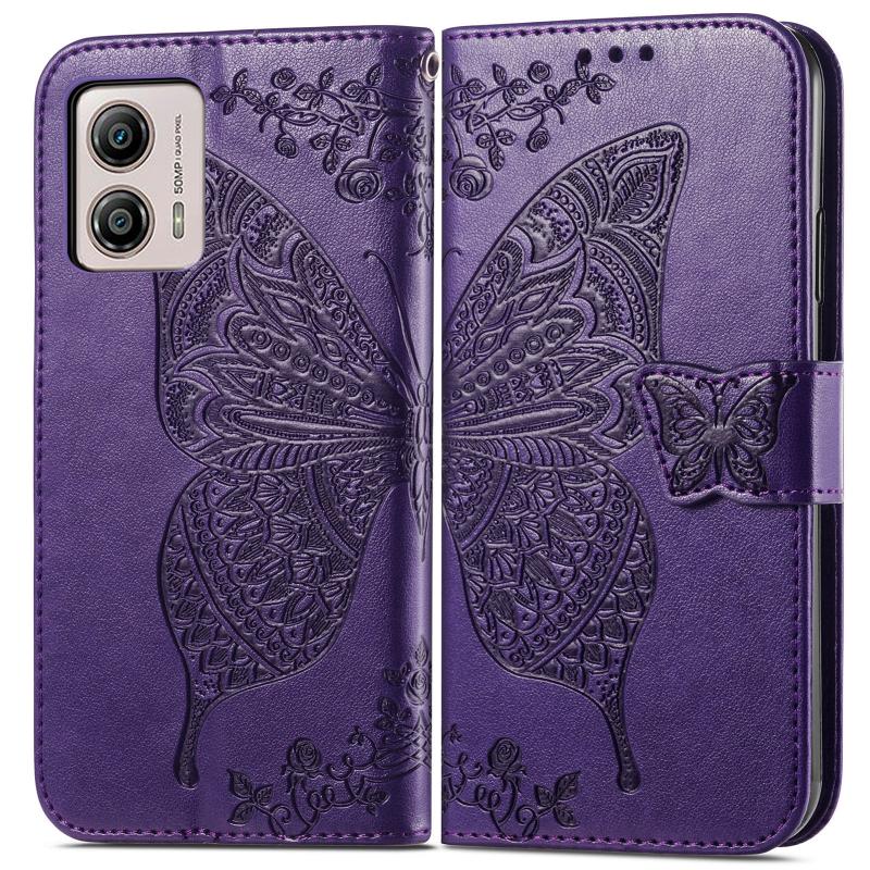 For Motorola Moto E13 Butterfly Love Flower Embossed Flip Leather Phone Case(Dark Purple)